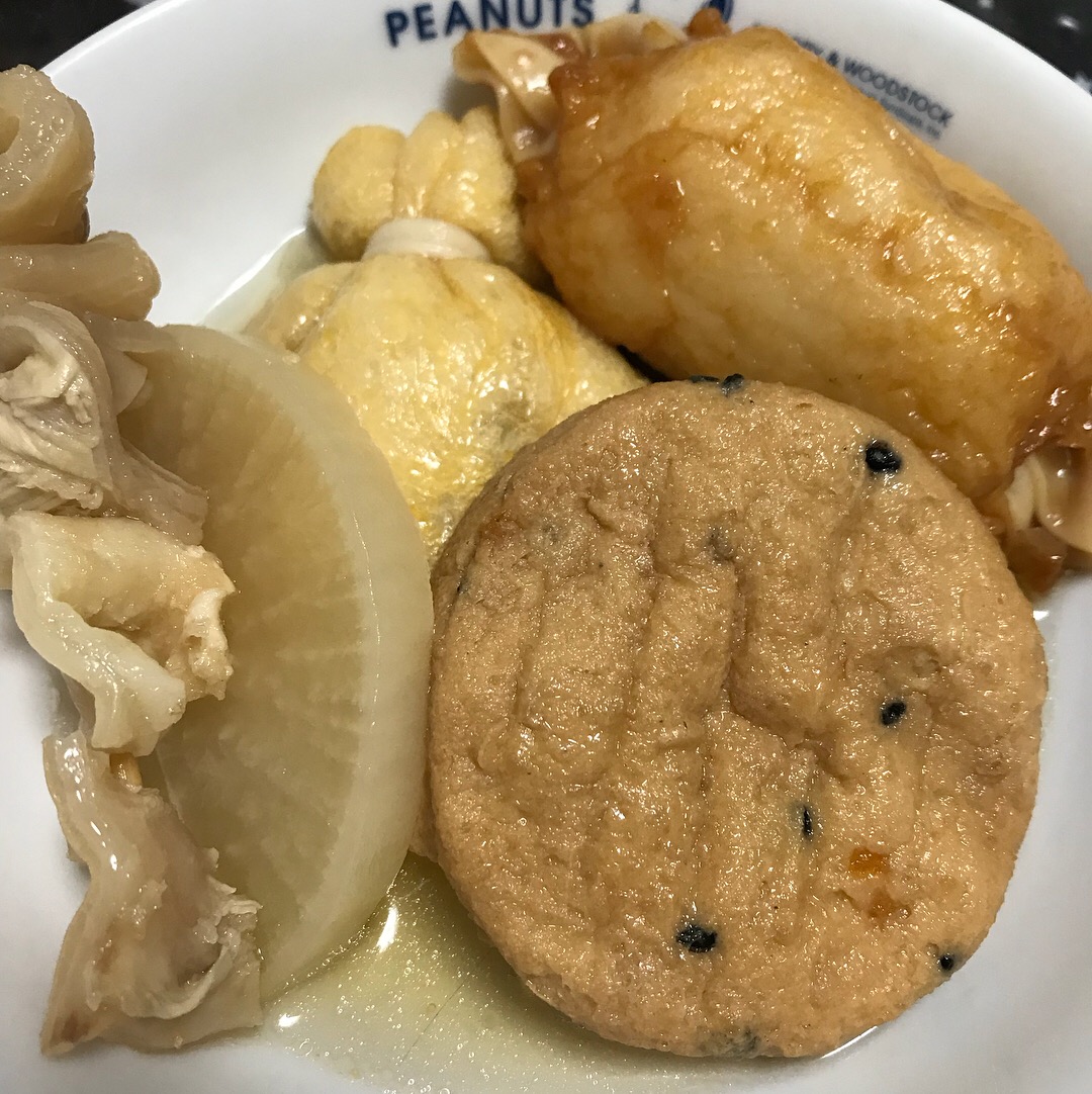 定番の餅入り巾着、がんもどき、ごぼう天スープが染みてとっても美味しい!