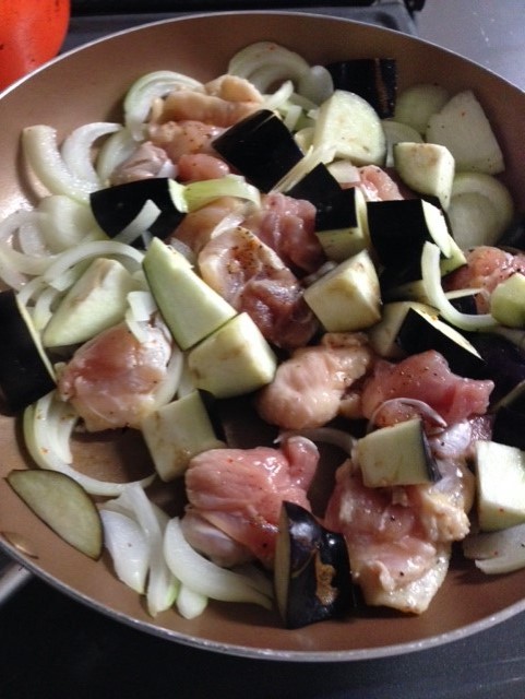 入れたのは玉ねぎ、ナス、鶏もも肉…シンプルです。